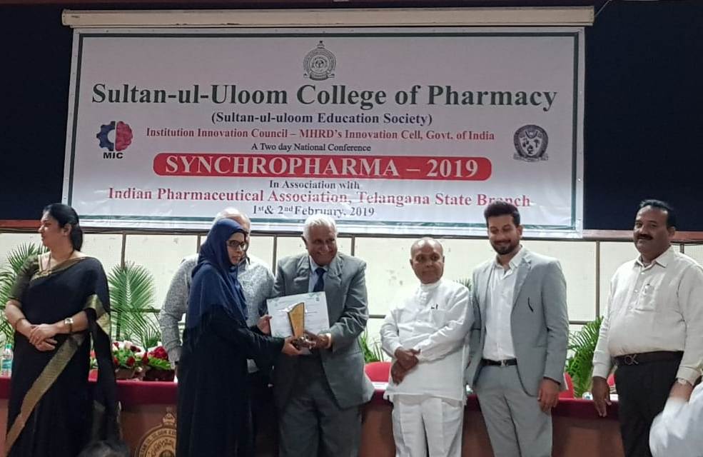 Ms. Maria Ansari, Pharm.D 4th Year Student, bagged First Prize for her Oral Presentation entitled “Patterns and Outcome of infection in MHD pateints” in the SYNCHROPHARMA – 2019 – National Conference  on Advances, Challenges & Future Strategies in the Pharmaceutical Industry & Pharmaceutical Care on 1st & 2nd February 2019 at Sultan-ul-Uloom College of Pharmacy, Hyderabad, Telangana, India.